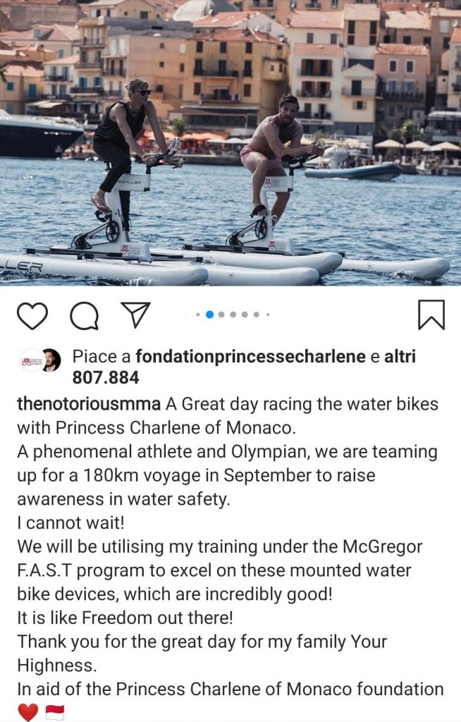 La prossima maratona di endurance, in realtà, è annunciata tra il 12 settembre 2020 e coinvolge due squadre composte ciascuna da ben 4 atleti. L’appuntamento è per a mezzogiorno da Calvi. Da qui, destinazione Principato di Monaco per una distanza stimata in 180 chilometri, gli atleti inforcheranno una Schiller S1, considerata tra le l’idro-bike tecnologicamente più perfomanti, capace di raggiungere fino a 13 km/h senza alcun motore di supporto. Questa volta, secondo le recenti comunicazioni ricevute, anche la Principessa Charlène di Monaco sarà tra i partecipanti e si alternerà nella traversata in staffetta, della durata di quasi 24 ore, fino a raggiungere la banchina dello Yacht Club di Monaco il giorno successivo. Con l’obiettivo di diffondere e sensibilizzare il grande pubblico sui diversi dai programmi promossi dalla sua Fondazione – come Learn to swim, per imparare a nuotare; Water Safety, per prevenire gli annegamenti tra bambini di paesi meno civilizzati, ed il progetto educativo “Sport & Education”, n.d.r. – fin dal 2012 ha contribuito a formare più di 730.000 persone in 34 paesi. Nella squadra ‘Princier’, con la Principessa Charlène ci sarà il fratello, Gareth Wittstock, Conor MCGregor ed un altro misterioso atleta il cui nome sarà svelato tra qualche settimana insieme agli altri partecipanti. Secondo quanto dichiarato dallo stesso ‘The Notorius’ recentemente, sul suo profilo Instagram, per il training preparatorio la moglie del Principe Alberto II di Monaco utilizzerà il suo programma McGregor F.A.S.T. Ed intanto lanciato anche sui social e su Youtube il teaser dell’iniziativa accessibile cliccando qui.