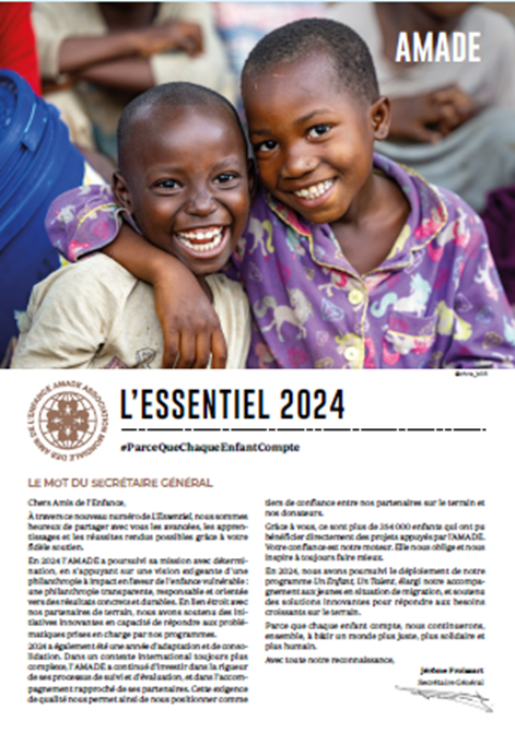 Il dato più significativo riguarda il sostegno diretto a 19 associazioni partner, che ha permesso di raggiungere 354.000 bambini in diverse aree del mondo. Questo risultato testimonia la capacità di AMADE di creare reti di collaborazione efficaci e di trasformare le risorse raccolte in interventi concreti e misurabili.. Il programma 2024, invece, delineato nel documento “L’Essentiel 2024”, individua alcune linee strategiche che sono: