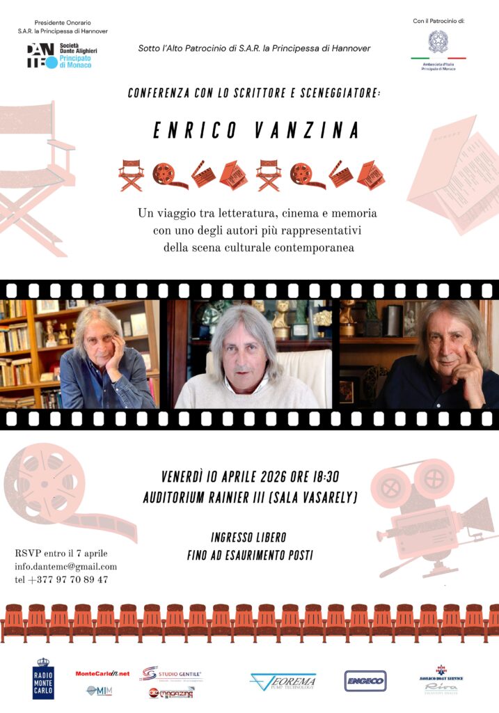 Non è un semplice incontro, ma un vero omaggio alla cultura italiana. Venerdì 10 aprile 2026, alle ore 18.30, la Società Dante Alighieri – Comitato del Principato di Monaco accoglierà nella Sala Vasarely dell’Auditorium Rainier III un protagonista assoluto del cinema e della letteratura: Enrico Vanzina.