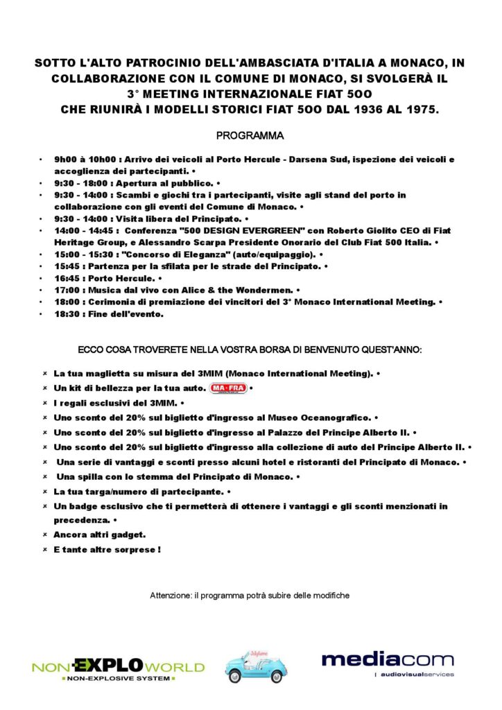 Tuttavia, se questo aspetto non interessa direttamente il 3° Meeting internazionale delle Fiat 500 storiche, previsto il 16 luglio prossimo, diverso è il caso della competizione equestre Jumping International de Monte-Carlo in programma da giovedì 29 giugno a sabato 1 luglio, e che da più di un decennio riunisce i migliori cavalieri del mondo per una competizione dove l’eleganze ed il glam si fondono in una sola cosa