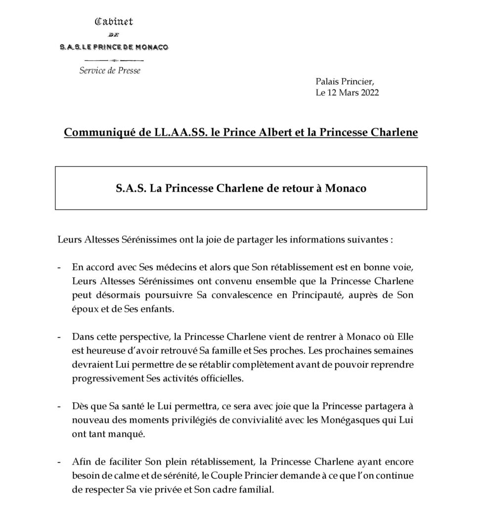 - Tuttavia, per facilitare il suo recupero completo, la principessa Charlene ha ancora bisogno di calma e serenità. Pertanto la coppia principesca chiede di continuare a rispettare la sua vita privata e il suo ambiente familiare.
