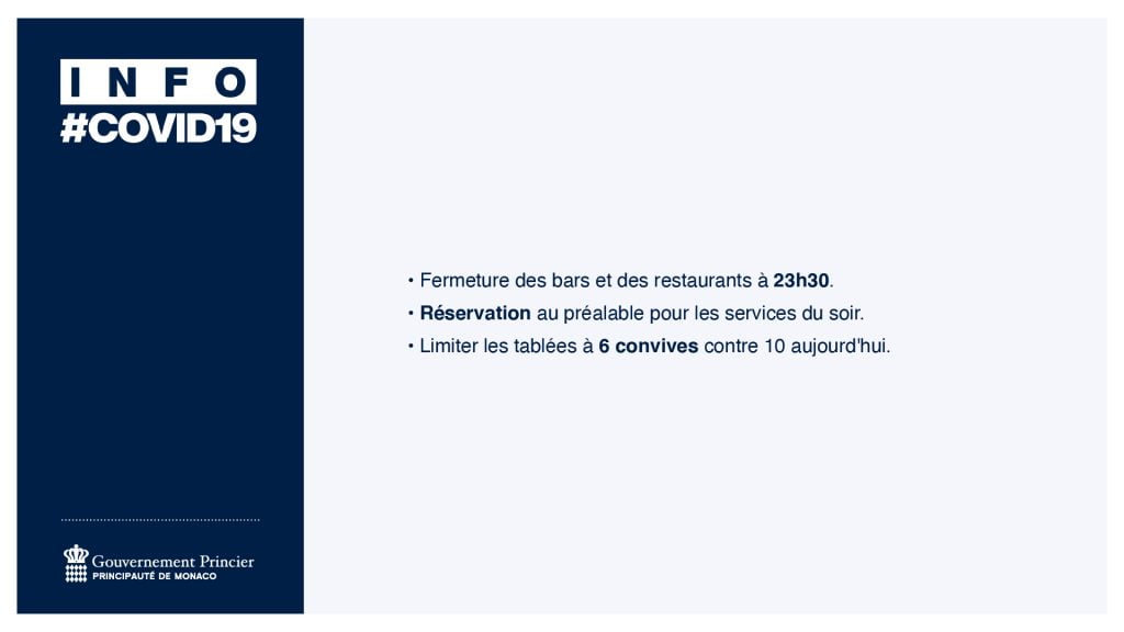 Questa volta il Principato di Monaco non si è allineato ai vicini francesi che hanno imposto il coprifuoco a partire da stasera a mezzanotte perché SEM Pierre Dartout, nel discorso pronunciato sul canale televisivo MonacoInfo, su richiesta del Sovrano, ha specificato le nuove misure anti-Covid19 adattate alla popolazione monegasca. Tra queste la chiusura alle 23h30 dei ristoranti e bar, prenotazione obbligatoria la sera e tavolate consentite per un massimo di 6 persone, chiusura dei Casinò dopo la mezzanotte e altre misure che saranno valide fino al 1 dicembre.
