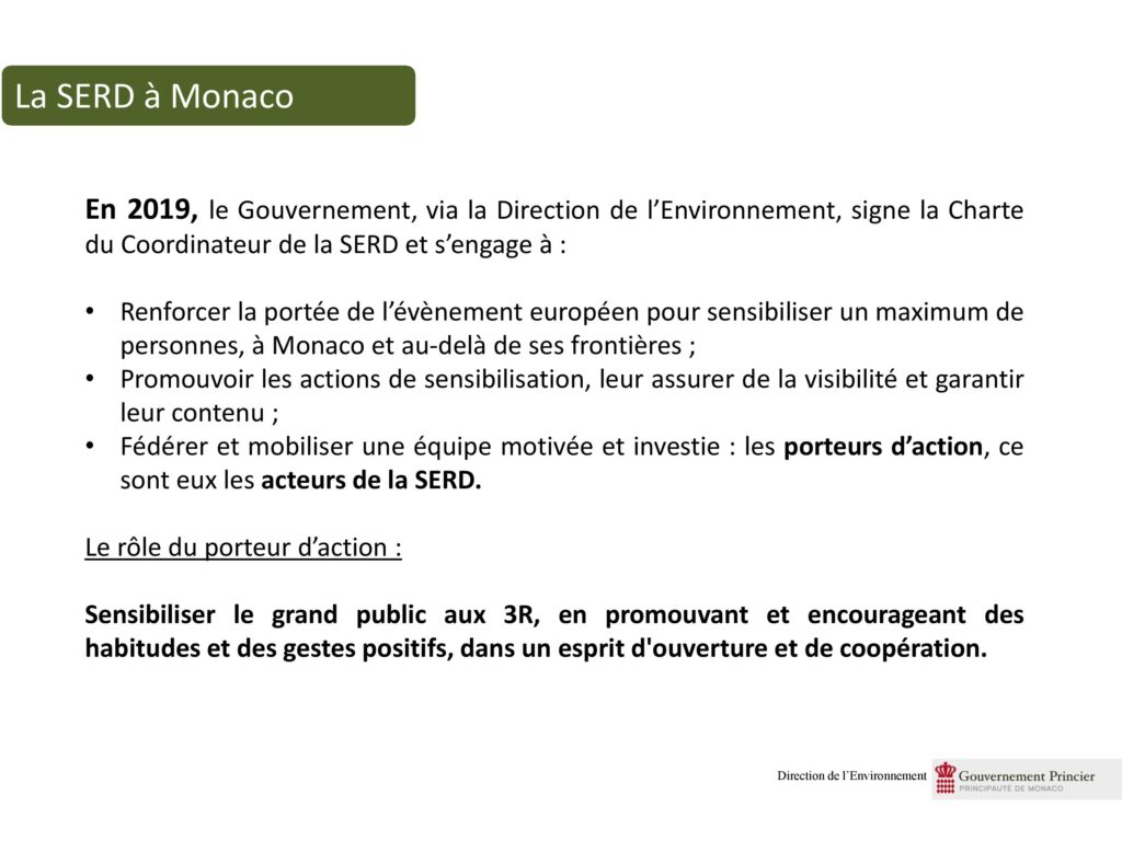 Mercoledì 20 ottobre, il Dipartimento dell’Ambiente monegasco ha organizzato la consegna degli attestati di partecipazione nel corso di una cerimonia che si è svolta al Museo Oceanografico di Monaco, in presenza dei protagonisti che hanno animato la Semaine Européenne pour la Réduction des Déchets (SERD) 2020, responsabili di attività che hanno avuto luogo lo scorso anno durante l’ultima settimana di novembre. Come promemoria, il Principato ha aderito al SERD fin dal 2019, e per l’occasione furono moltissime le iniziative private e pubbliche alla quale hanno partecipati molte entità, sia private che pubbliche. La riunione, organizzata mercoledì scorso, inoltre, è stata l’occasione per rivedere le due precedenti manifestazioni SERD, permettendo di ricontestualizzare il ruolo della consapevolezza pubblica nella strategia amministrativa in merito alla sensibilizzazione di queste tematiche. In effetti, Monaco ha una politica ambiziosa di riduzione dei rifiuti, che non può essere raggiunta senza la collaborazione di tutte le parti interessate e il sostegno pubblico ai suoi obiettivi. Come ricompensa finale, poi, una colazione a rifiuti zero, preparata e offerta dal ristorante La Terrasse, – che ha ottenuto il marchio ‘Restaurant Engagé’ -, ha dato l’opportunità al pubblico di partecipare all’evento e scambiare opinioni in merito, approfittando di in un momento conviviale e informale