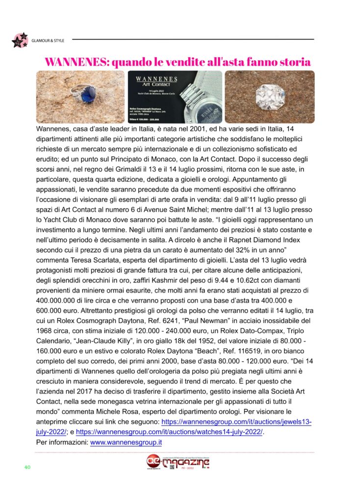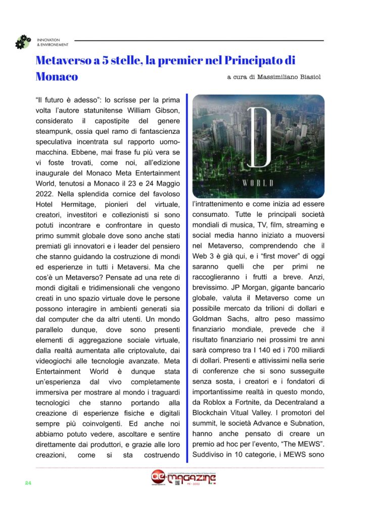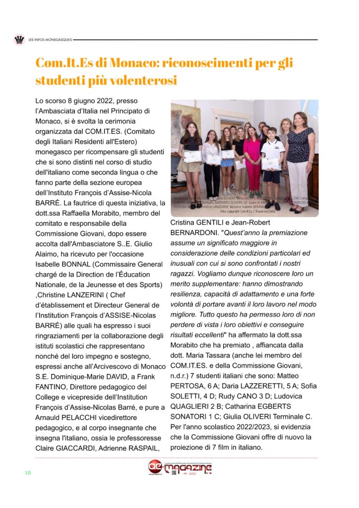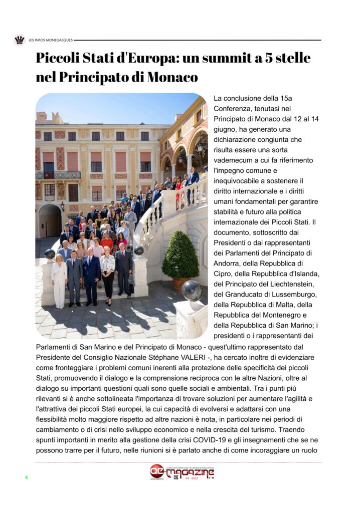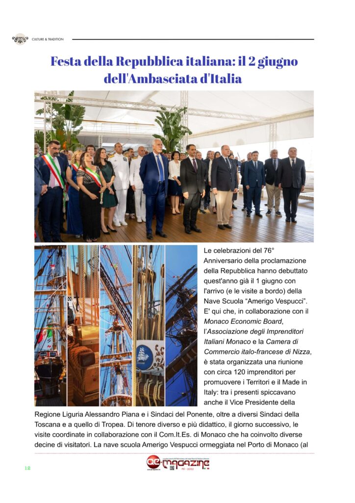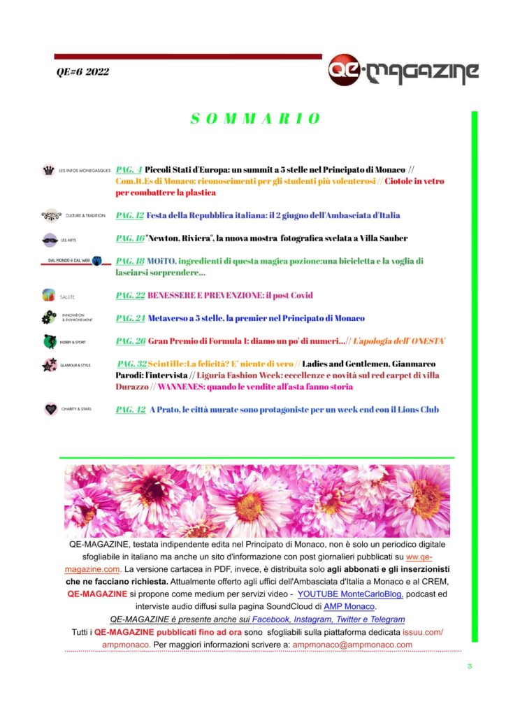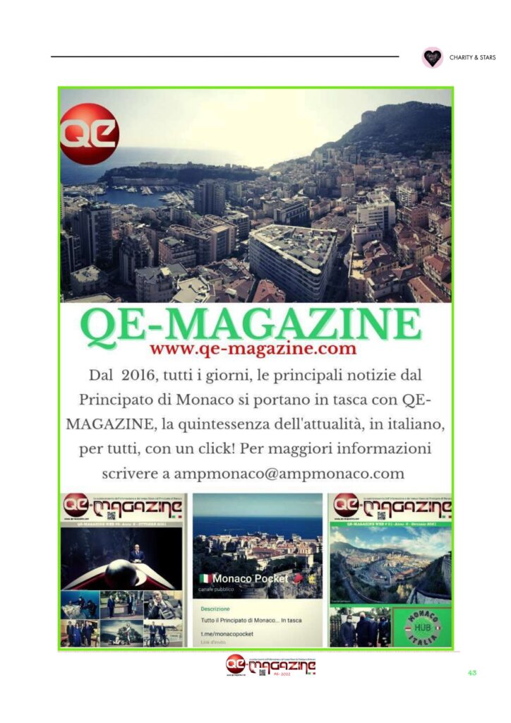 QE-MAGAZINE è il primo ed unico periodico – ora mensile – digitale in italiano del Principato di Monaco (Facebook, Instagram e Twitter) che propone anche una versione stampabile del magazine digitale ESCLUSIVAMENTE agli abbonati che ne facciano richiesta. Seguiteci anche su nostro canale YOUTUBE MonteCarloBlog e anche sul nostro canale Telegram Monaco Pocket