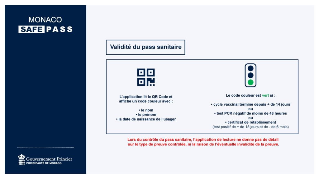 Riconosciuto dalla Francia, il MONACO SAFE PASS può essere, volendo, “convertito” in un pass sanitario valido in tutta l’Unione Europea. Quello che conta, secondo i tecnici presenti alla conferenza stampa, è il possesso , una volta generato, di questo QR a cui si riferiscono le informazioni utili per l’utente, che sia esso guarito, vaccinato o sottoposto a test PCR. In sostanza, alla lettura del codice, esibito in formato cartaceo o sullo smartphone, il controllore potrà sapere se un individuo è completamente vaccinato (cioè il suo ciclo di vaccinazione è finito); ristabilito dalla Covid19 per almeno 2 settimane e fino a 6 mesi; oppure in possesso di un test PCR negativo di -48 ore. Ogni QRCode scansionato genera due indicazioni, rossa o verde a seconda della situazione registrata in quel preciso istante. Ma se il Monaco Safe Pass è valido a Monaco e in Francia, per quanto riconosciuta nei paesi dell’Unione Europea e nei paesi con accordi con la Francia e l’Unione Europea, lo stesso non è sufficiente per viaggiare in tutta Europa. Si parla, in questo caso, di Pass europeo, la cui validità si estende in tutti i paesi dell’Unione Europea, nonché in Islanda, Liechtenstein, Norvegia e Svizzera, qualora il Monaco Safe Pass viene convertito in un Health Pass. Per farlo i residenti che desiderano utilizzare questo documento devono manifestare il consenso al momento della richiesta dell’Health Pass poiché i dati personali di ogni possessore saranno trasferiti in Francia. Tuttavia nessuna informazione sarà memorizzata oltre frontiera al di là dello scopo previsto da questo unico documento chiamato Certificato digitale Covid dell’UE che, comunque, non esonera il possessore dalle norme sanitarie in vigore nel proprio paese. Per saperne di più cliccare qui. Tra l’altro, si ricorda, che il centro screening e quello destinato alla somministrazione della vaccinazione si trasferisce all’Auditorium Rainier III in due tempi: il 25 giugno per il primo caso, dal 1 luglio nel secondo. L’amministrazione ritiene possibile che per i primi tempi siano molte le richieste da evadere, riferendosi alle domande inoltrate per via telematica.