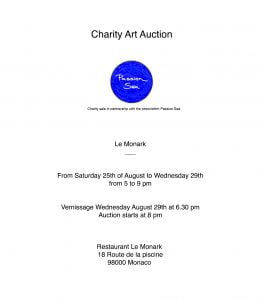 L’associazione Passion Sea, organizzazione internazionale no-profit di Monaco creata da Helga Piaget per sensibilizzare i giovani alla preservazione ed il rispetto dei mari attraverso progetti educativi ed artistici invita tutti alla sua prossima iniziativa: una ricca vendita all’asta prevista mercoledì 29 agosto alle 20h00 presso LE MONARK, 18 rue de la Piscine. In questi giorni, invece, è possibile ammirare l’esposizione delle sculture e le opere che, con la loro vendita, contribuiranno a finanziare le attività dell’associazione monegasca.