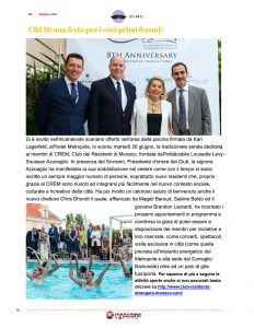 Infine, passaggio obbligato per la festa del CREM che ha celebrato 8 anni di attività, in presenta del Principe Alberto II di Monaco – che abbiamo riportato in copertina – e un accenno all’ esposizione aperta gratuitamente al pubblico dal 10 luglio prossimo, e che anticipa la prestigiosa vendita all’asta di gioielli del 13 luglio, a cui seguirà quella di auto da collezione e sportive, il 14 luglio, organizzata al Monte Carlo Bay & Resort dal gruppo Wannenes – Art Contact.