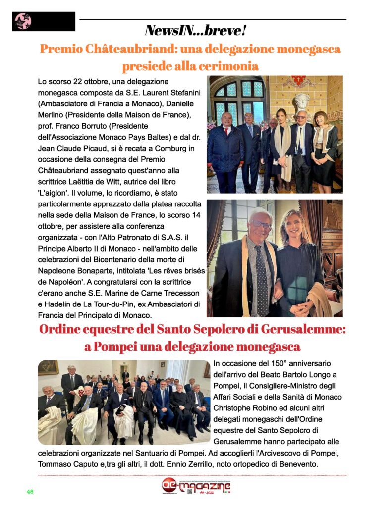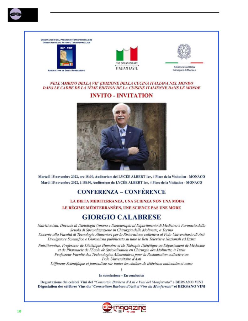 L’iniziativa che ha origine direttamente dal Palazzo, dove lavora il responsabile dei fotografi ‘royal’ Gaetano Luci – che, detto tra noi, è in buona parte ispiratore di questo viaggio in quanto molochiese di nascita e monegasco d’adozione – è valsa al Sovrano una laurea honoris causa e tre cittadinanze onorarie. Considerato, per il 2022, come ultimo appuntamento in Italia coordinato dal ramo italiano dell’associazione Siti storici Grimaldi di Monaco (creata nel 2021 sulla falsariga di quella istituita nel 2015 a Mentone), questa e altre missioni stanno permettendo di delineare, grazie anche alle numerose targhe apposte ogni volta, una mappa che giustifica come gli antichi feudi dei Grimaldi sul territorio italiano siano numerosi. Così tanto da aver fatto nascere l’esigenza di creare, a maggio del 2022, una federazione che collega le diverse località coinvolte, sia francesi che italiane, accomunate dalle loro origini risalenti ai Grimaldi di Genova e, per estensione, a quelli di Monaco. Anche per questa ragione, sono più che sicura che il Principe reggente, in particolare quest’ultimo, si senta molto vicino all’Italia e agli italiani, non solo per ragioni storiche o affinità culturali. Del resto, si sa, la fascinazione è reciproca. L’effetto ‘incantamento’ comprende, a dire il vero, anche la Costa Azzurra dove non c’è week-end che non offra qualcosa da scoprire. Ad esempio, a Mentone, è in corso oggi e domani, su iniziativa del Club Lions locale, il Salone des Saveurs dove, pensate un po’, le telecamere di History Food Channel TV gireranno tra gli stand per carpire i segreti degli espositori, le delizie offerte dagli chef e molto altro ancora. Se non è magia questa…BUONA LETTURA A TUTTI!