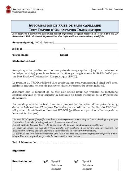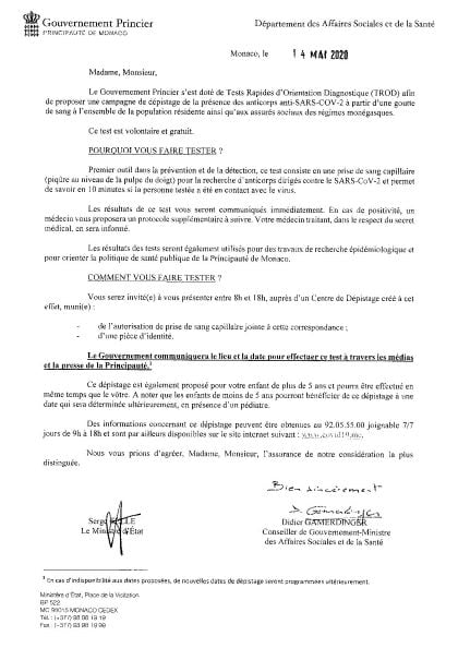 La lettera di convocazione agli aventi diritto – ma non a tutti – è arrivata lunedì 18 maggio, benché la data d’invio riporti 14 maggio 2020. E’ firmata dal Ministro di Stato Serge Telle e dal Consigliere-Ministro degli Affari Sociali e della Salute Didier Gamerdinger. All’interno della missiva la presentazione di questa iniziativa, lo screening che fa uso della tecnica del TROD (test rapido d’orientamento diagnostico) che assomiglia a quello effettuato in farmacia, quando con una sola goccia di sangue preso pungendo il dito, si verifica il tasso glicemico del paziente. Qui, invece, si ricercano gli anticorpi di classe IgM e IgG specifico per la SARS-CoV-2 generati dall’organismo in risposta ad un’infezione o di un determinato agente patogeno. Il test sierologico proposto a Monaco, eseguito con l’aiuto di molti volontari provenienti da diverse associazioni benefiche monegasche, si svolgono sempre e comunque in presenza di un medico che, in funzione del risultato, che è istantaneo e segnalato subito alla persona testata la quale riceverà conferma del risultato o via email o per posta. Nel caso risultasse positiva, come indicato nella lettera del Governo di Monaco, segue il tampone, la quarantena presso la propria abitazione o il ricovero, nei casi più gravi. Lo screening è esteso a 90 mila individui (residenti, lavoratori pendolari e studenti) invitati a recarsi dalle 8h alle 18h pressi i due centri di screening ma non serve essere digiuni. E la firma della liberatoria, in cui si spiega che l’esito del test diagnostico sarà utilizzato dal Governo di Monaco ad ogni fine statistico, è fondamentale per procedere all’esame stesso.