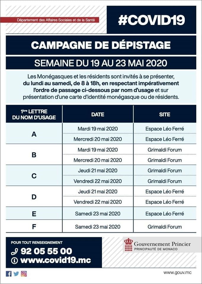 E’ iniziato ieri, per i residenti del Principato di Monaco il cui cognome inizia per A e B, lo screening sierologico (non venoso) offerto gratuitamente – e su base volontaria – dal Governo monegasco per controllare chi, magari asintomatico, possa aver contratto il Covid19. I luoghi deputati per questa iniziativa sono due centri attrezzati per l’occorrenza: il Grimaldi Forum di Monaco e il centro Leo Ferré, a Fontvieille. Dettagli…