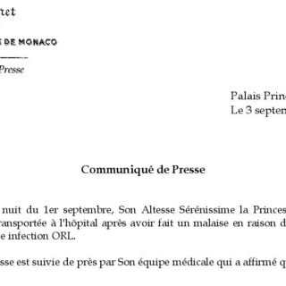Con un laconico comunicato stampa il Palazzo Princier si pronuncia stasera alle 21:27 rassicurando sulle condizioni di salute della Principessa...