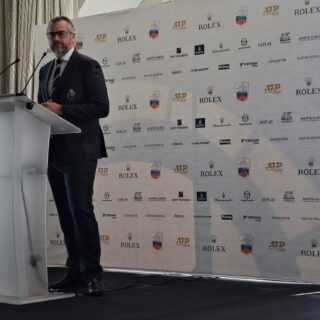 Sulle tavole apparecchiate per la presentazione ufficiale del Rolex Monte Carlo Masters 2025, organizzata al Monte Carlo Bay il 7...