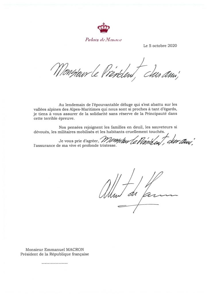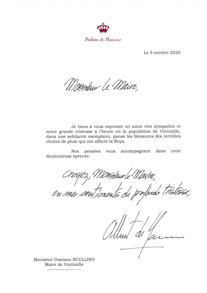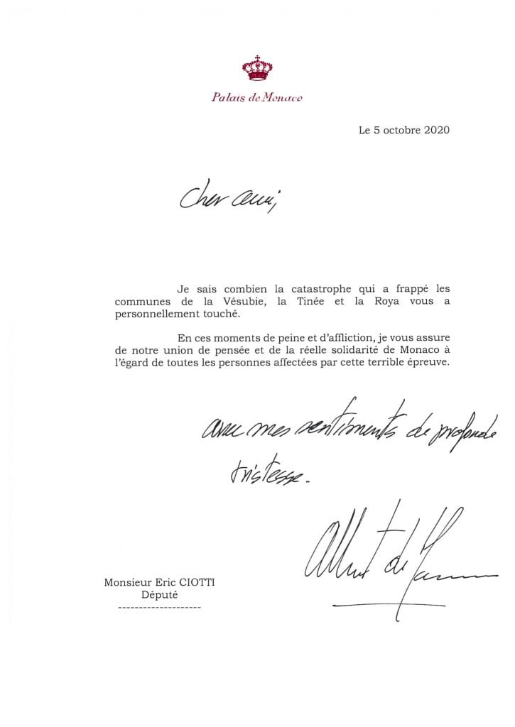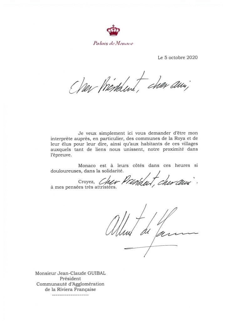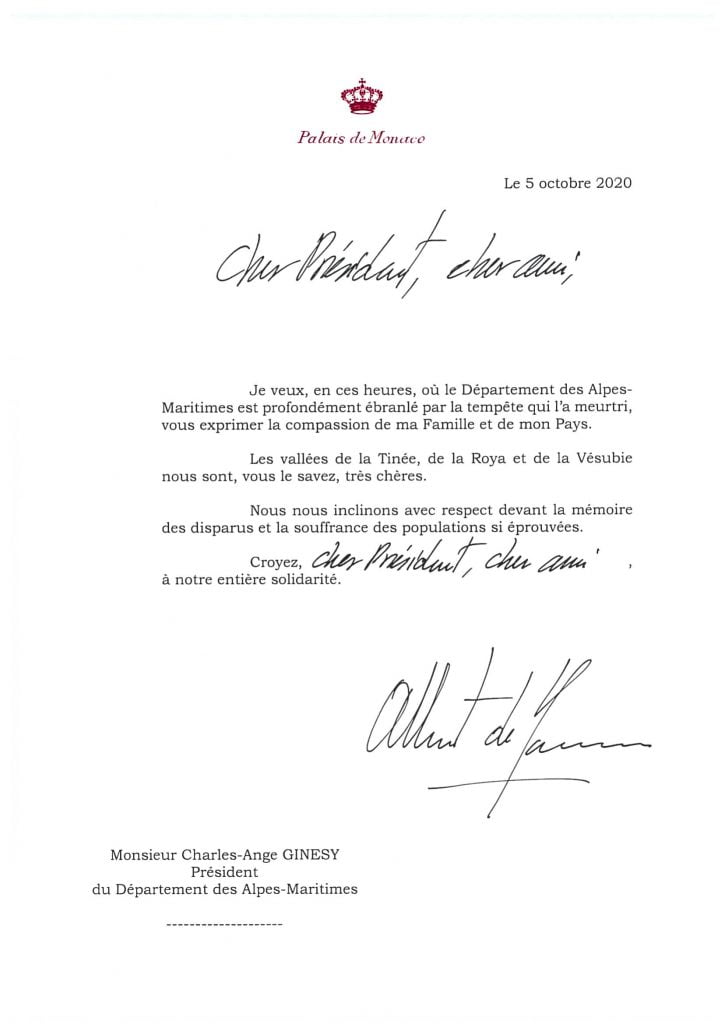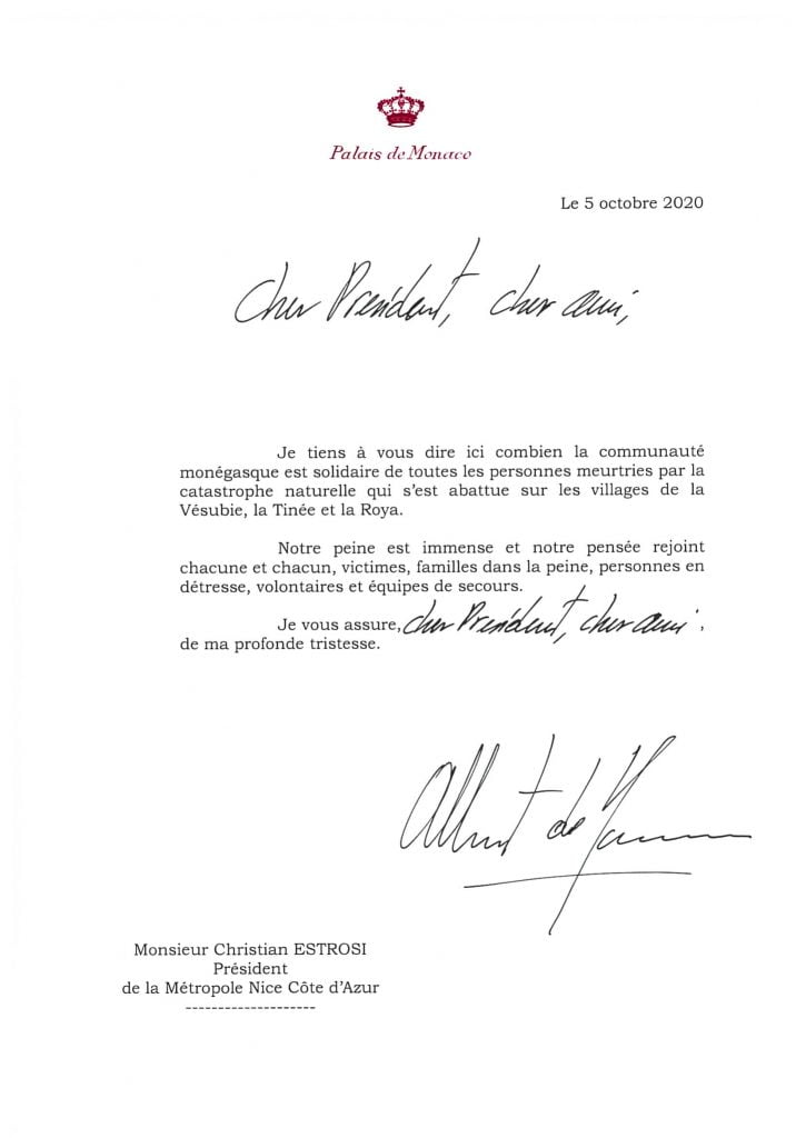 Contemporaneamente sui social media, come anche al Carrefour di Monaco, si sono organizzate collette e centri di raccolta per assistere le famiglie in difficoltà. Lunedì 5 ottobre, sono state diffuse due note stampa, una proveniente dalla Croce Rossa di Monaco e l’altra dalla Diocesi Monegasca. La prima comunica che è stato lanciato un appello per le donazioni alle vittime della tempesta Alex in quanto l’associazione, mobilitata a partire da venerdì, sta valutando le esigenze dei comuni colpiti dal disastro ed agire concretamente sul posto: ‘Le squadre della Croce Rossa monegasca si sono mobilitate dopo il passaggio della tempesta Alex venerdì scorso nelle Alpi Marittime e in Italia, colpendo pesantemente la popolazione, in particolare nei settori di Roya e Vésubie. Venerdì le squadre hanno partecipato alla realizzazione di una struttura di accoglienza a Monaco (in una palestra). A partire da sabato, la Croce Rossa monegasca ha fornito sostegno in un centro di accoglienza e di accoglienza d’emergenza aperto presso la palestra Carei di Mentone per le vittime della catastrofe. In collaborazione con le autorità locali e le strutture di intervento, un’équipe è già pronta ad intervenire per portare i beni di prima necessità (acqua, indumenti caldi, cibo) e per effettuare una prima valutazione dei bisogni al fine di adeguare la risposta all’emergenza. Gli operatori del pronto soccorso e gli operatori logistici, formati per questo tipo di calamità, saranno inizialmente in grado di aiutare a ripulire, fornendo supporto psicologico e beni di prima necessità alla popolazione colpita. Più di 70 membri volontari sono pronti per essere inviati nelle aree più colpite‘. A tal fine sono aperte le sottoscrizioni per fare donazioni. Per partecipare è possibile inviare un assegno bancario (intestato alla Croce Rossa Monegasca – TEMPETE ALEX) oppure depositare contanti presso la sede della Croce Rossa Monegasca – 27 bd de Suisse, 98000 Monaco (tel. +377 97.97.68.00). Diversamente, sull’interfaccia presente sul sito web www.croix-rouge.mc, selezionando “Alluvione nelle Alpi Marittime” (Action inondations dans les Alpes-Maritimes) è possibile fare un bonifico bancario (RIB disponibile sulla nostra pagina web dedicata alle donazioni). Inoltre SAS il Principe Alberto II di Monaco ha voluto esprimere la sua vicinanza alle popolazioni colpite da questa calamità scrivendo 6 lettere ai rispettivi sindaci e rappresentanti istituzionali dell’aree colpite, sia in Francia che in Italia, come vedete qui sotto.