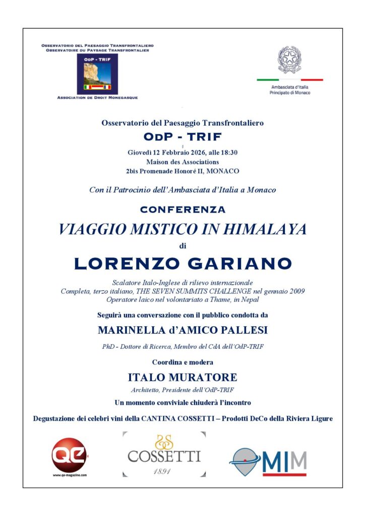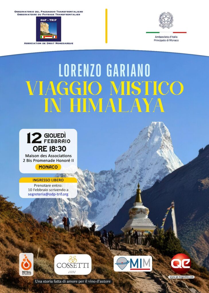 La Maison des Associations di Monaco (2bis Promenade Honoré II) ospiterà, giovedì 12 febbraio 2026 alle ore 18:30, un evento di grande fascino e ispirazione: la conferenza “Viaggio Mistico in Himalaya” di Lorenzo Gariano, alpinista e scrittore che ha compiuto imprese straordinarie sulle vette più alte del pianeta. L’iniziativa si svolge con il Patrocinio dell’Ambasciata d’Italia.